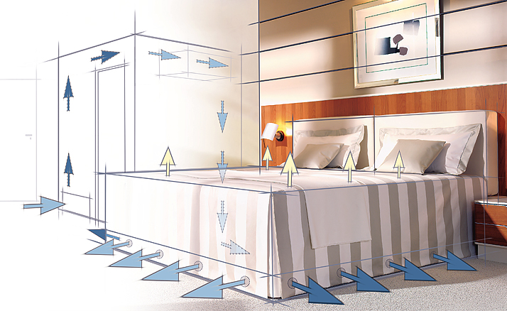 Das modular aufgebaute Air.motion Klimasystem ist unsichtbar und unhörbar außerhalb des Schlafbereiches installiert. Anstelle des Kaltlufteinfalls von der Decke her strömt jetzt kühle Luft zugfrei über das Klimaelement Bett in Bodenhöhe ein – und verteilt sich sanft und gleichmäßig im ganzen Raum.